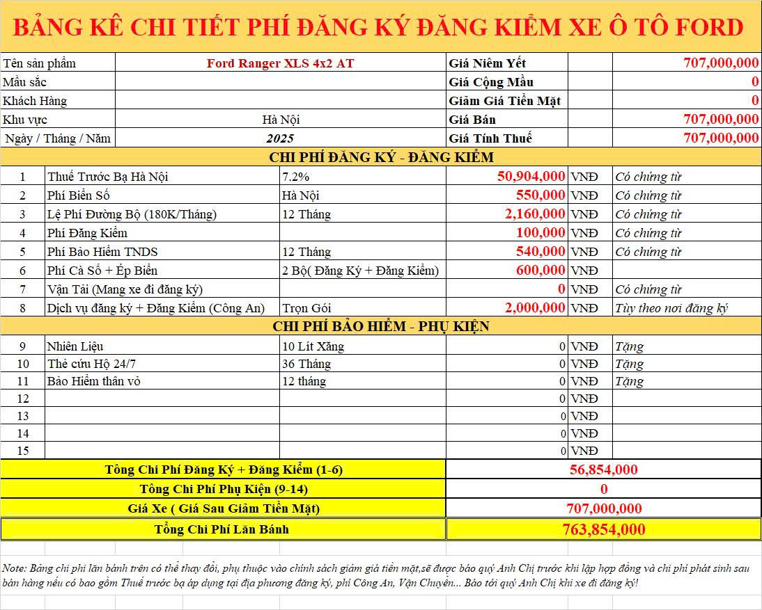 Chi Phí đăng ký này là chi phí tạm tính cho sản phẩm. Chi Phí chưa trừ khuyến mại bằng tiền mặt, cũng như là khuyến mại bảo hiểm Thân vỏ xe. Lên Giá tính ra cao hơn với thực tế để mua xe. vì vậy quá khách hàng mua xe Ford Ranger XLS 4×2 AT 2025 có thể tham khảo chi phí, rồi tính toán trừ đi phần khuyến mại tiền mặt của xe, và phụ kiện khuyến mại đi kèm. Chính vì vậy Giá bán hoàn thiện xe Ford Ranger XLS 4×2 AT 2025 sẽ rẻ hơn, vì vậy anh chị có thể gọi điện trược tiếp để biết thêm về khuyến mại, còn mọi chi phí đăng ký ở trên đói với một chiếc xe là chuẩn theo nghĩa vụ của nhà nước.